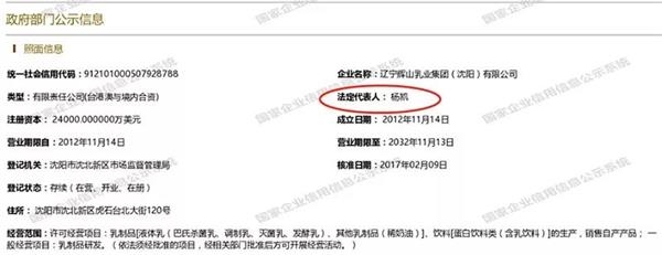 不过,杨凯至今仍是辉山乳业的主要负责人。位于虎台石大街120号的辽宁辉山乳业集团(沈阳)有限公司的工商登记资料显示,目前,杨凯仍是公司的法人代表。