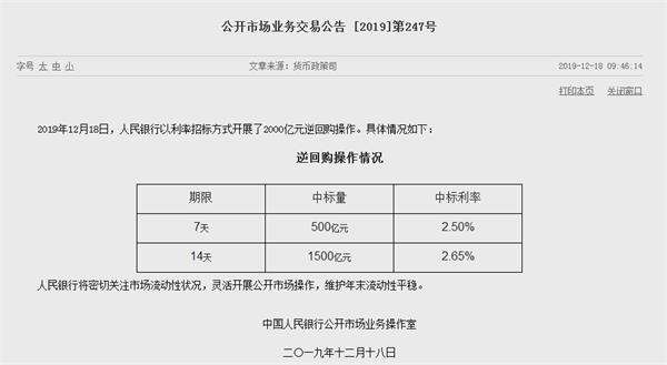 昨日(12月18日),央行发布公告称,以利率招标方式开展了2000亿元逆回购操作,其中7天期逆回购中标量500亿元,中标利率2.50%;14天期逆回购中标量1500亿元,中标利率2.65%。