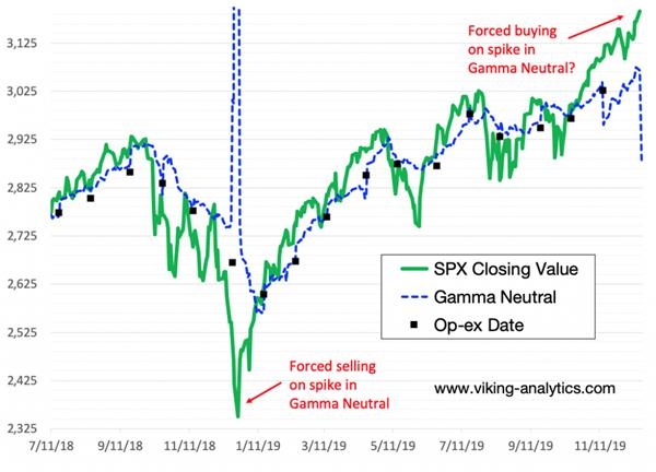 Lytikainen在RealInvestmentAdvice.com上发文表示,去年12月,在当年最后一个月期权到期之时及附近,标普500指数下跌了近300点。这种急剧下降与市场伽玛(gamma)的飙升同时发生,他认为,这种下跌是由于看空期权的卖方,所带动的停损卖压所加大的。