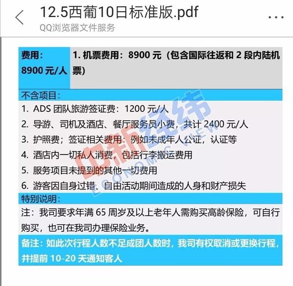刘女士介绍道,今年向权品旅游客服咨询了多个国外旅行目的地信息,都被告知无法出行,最后确定了参加12月5日前往葡萄牙、西班牙10日游的旅行产品,成团人数20人。即将报名出发之际,却被客服告知标准团人数不够无法出行,需缴纳3000元至5000元升级成更高档位的“会员团”才有可能出行。