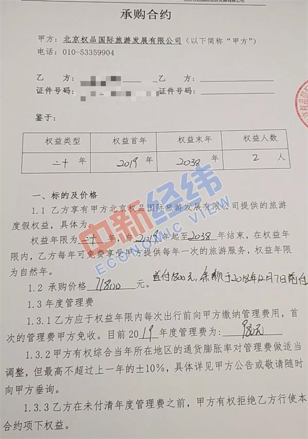 在刘女士提供的《承购合约》内,中新经纬记者注意到,甲方为北京权品国际旅游发展有限公司,乙方为刘女士的母亲,从2019年至2038年结束,在20年内,该旅游公司为刘女士的母亲每年提供一次旅游服务,承购价格为71800元,费用包含目的地住宿、团费及行程内景点门票,费用中并不包含机票及自费项目,且旅游线路由甲方提供,消费者可以自由选择。