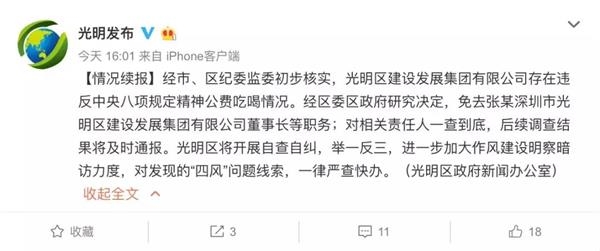 今天(13日)下午4时,光明区委宣传部官方微博发布:经深圳市、光明区纪委监委初步核实,光明区建设发展集团有限公司存在违反中央八项规定精神公费吃喝情况。经区委区政府研究决定,免去张某深圳市光明区建设发展集团有限公司董事长等职务;对相关责任人一查到底,后续调查结果将及时通报。光明区将开展自查自纠,举一反三,进一步加大作风建设明察暗访力度,对发现的“四风”问题线索,一律严查快办。