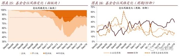 1) 中小市值公司重仓仓位继续提升,创业板重仓仓位升至近三年高位。创业板重仓仓位由三季度的13.8%明显提升至15.7%。2019年7月正式开板的科创板重仓仓位由三季度的0.1%提升至0.5%。