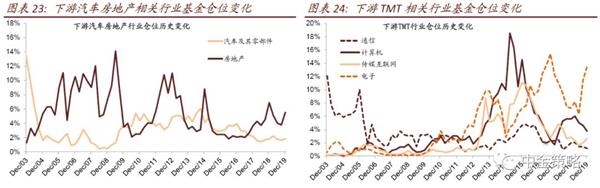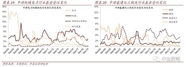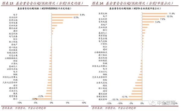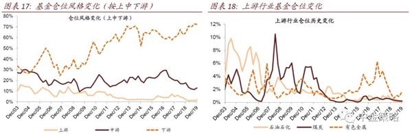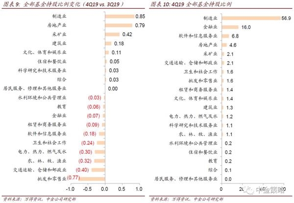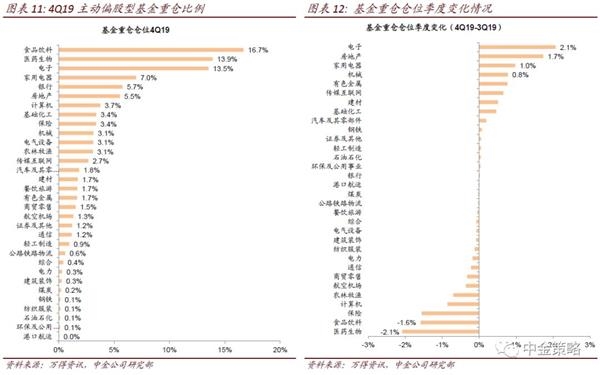2) 加仓周期和成长。部分传媒及新能源汽车产业链相关个股净增持家数较多。去年11月中下旬央行座谈会之后政策稳增长信号明确,去年年底附近国内制造业PMI已经从低位回升。同时地产行业库存偏低,竣工在提速。在此背景下估值不高、前期表现明显落后的周期性板块,如地产、机械、建材、化工、钢铁等板块重仓仓位有所上升。如万科为四季度主动偏股型基金单季净增持家数最高的公司(111家)。成长风格来看,5G等相关产业链仍受市场的广泛关注,京东方、信维通信等单季净增持家数较多;此前几年领跌的传媒板块受到关注,完美世界、游族网络等净增持家数较多;新能源汽车产业链相关的个股,如亿纬锂能、华友钴业等也有较多基金净增持。