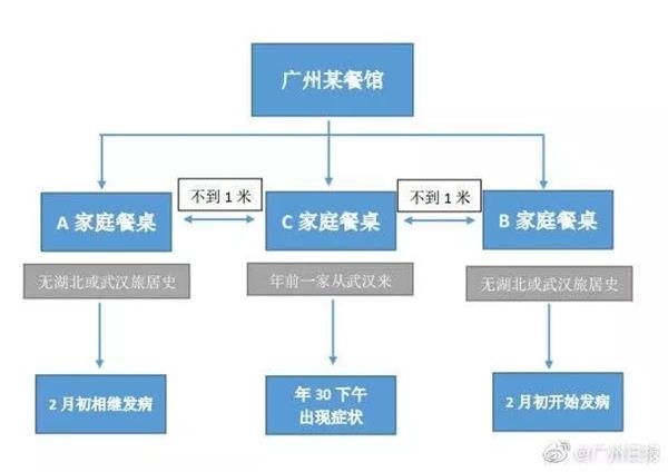 来自湖北的C家庭坐在中间,A、B家庭分别为C家庭的左右邻座。C家庭当天中午聚餐后,下午随即有人发病,而A、B家庭发病的时间也符合新冠肺炎的潜伏期。