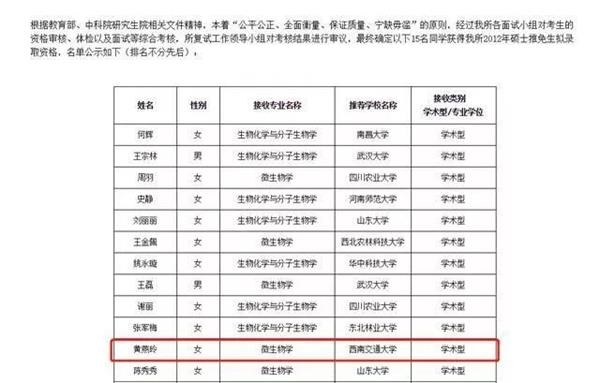 2月15日,一则关于“武汉病毒研究所一名女研究生黄燕玲是新冠病毒肺炎零号病人”的消息开始在互联网上流传。据网传信息,新冠肺炎零号病人系武汉病毒所科研人员,名叫黄燕玲,2012年考入武汉病毒研究所的硕士研究生。据中科院武汉病毒研究所发布于2011年11月4日的《2012年度推荐免试硕士研究生拟录取名单公示》显示,黄燕玲系西南交通大学推荐的学术性硕士,方向为微生物学。