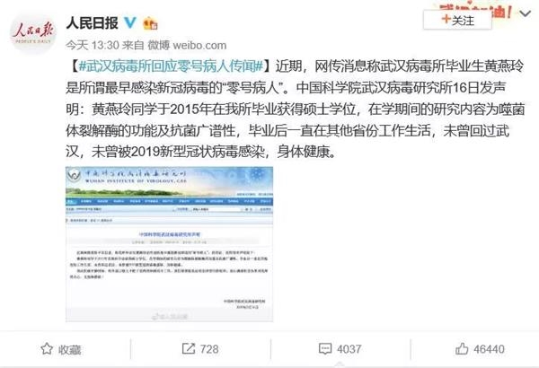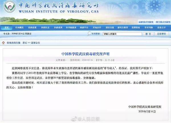 2月16日中午,据@人民日报官方微博报道,中国科学院武汉病毒研究所针对该所毕业生“黄燕玲系最早感染新冠病毒的零号病人”传闻,发布声明称,该信息不实,黄燕玲已于2015年毕业,毕业后一直在其他省份工作生活,未曾回过武汉,未曾被2019新型冠状病毒感染,身体健康。