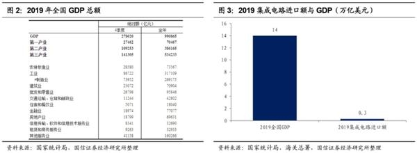 2019年集成电路进口额3055亿美元,占2019年中国GDP 99万亿人民币的2.2%,简单假设,假设进口的3055亿美元的集成电路都能够自给,可以增加GDP大约2.2%。