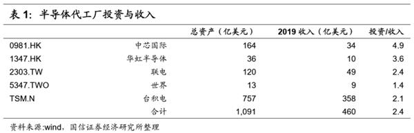 我们参考全球主流五家半导体代工厂的投资与收入比例,即: