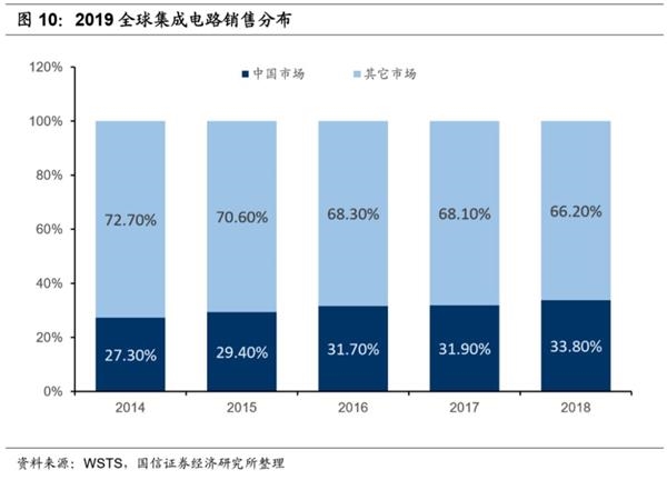 全球半导体销售市场中,中国市场占比逐渐提升,到2018年中国市场占全球半导体销售额的33.8%。