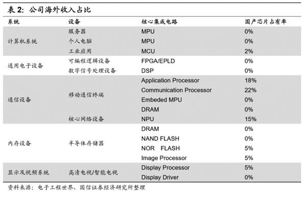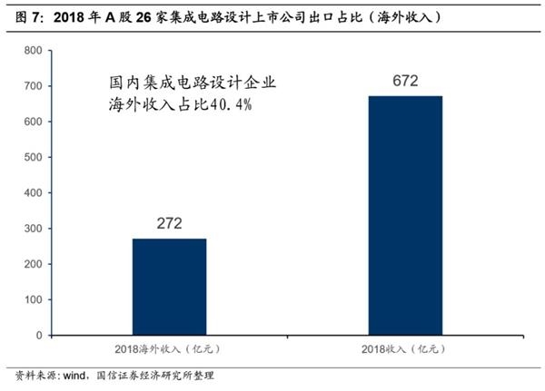 按照申万一级行业目录中的电子行业——半导体——集成电路,此分类中的26家集成电路设计公司为样本,26家集成电路公司的2018年合计海外收入占比为40.4%。