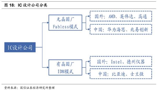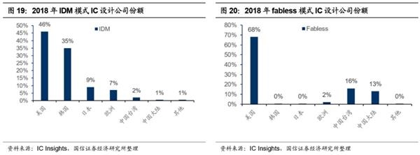 2018年美国芯片公司依然主导了整个芯片市场,全球市场份额占比超过50%。IC设计公司按照是否拥有工厂,分为无晶圆工厂的fabless模式,有晶圆工厂的IDM模式。
