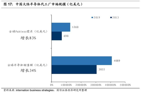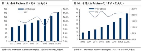 半导体代工增速超半导体行业增速,2013~2019年,全球半导体增长34%,而Fabless需求(对应代工厂收入)增加83%。