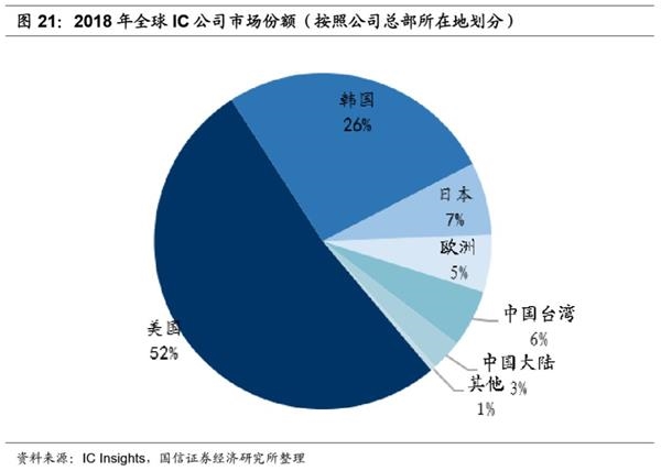 美国无晶圆厂芯片公司占据全球68%分市场份额,而美国有晶圆厂芯片公司占据全球46%分市场份额,两者合计市场份额未52%。