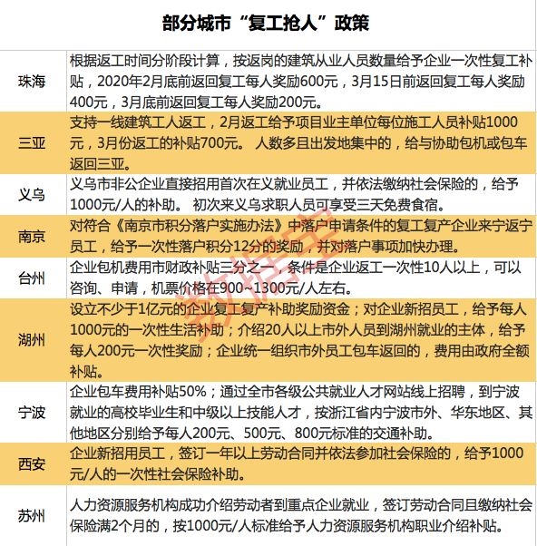 除接人外,各地更是出台了吸引眼球的复工补贴政策,报销、送钱、落户加分五花八门。