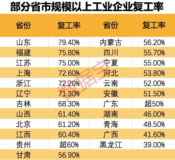 虽然返程人数与去年相比仍处低位,但各地复工进程已加速推进。数据宝根据公开信息整理,全国已有超过10个省(自治区、直辖市)的规模以上工业企业复工率超过60%,东部省市占据主流。山东、福建和江苏省的规上企业复工率超过75%,长三角地区上海、浙江和江苏的规上企业复工率均超过70%。