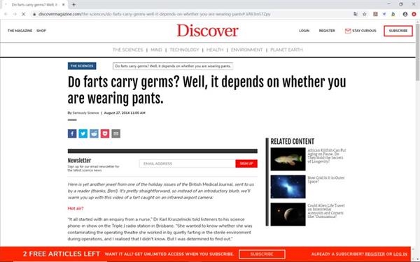 早几年前,就有一位爱思考的博士卡尔·克鲁塞尔尼基(Karl Kruszelnicki)与堪培拉的微生物学家卢克·田纳特(Luke Tennent),一起设计了一个实验。他们让一位同事在离培养皿5厘米远的地方,对着放屁。作为严谨的科学家,对照实验自然是必不可少的:先是穿裤子对着培养皿放屁,然后是脱了裤子对着培养皿放屁。然后将吸饱了人生之气的培养皿放入培养箱,等第二天再观察培养皿上是不是有细菌的生长。
