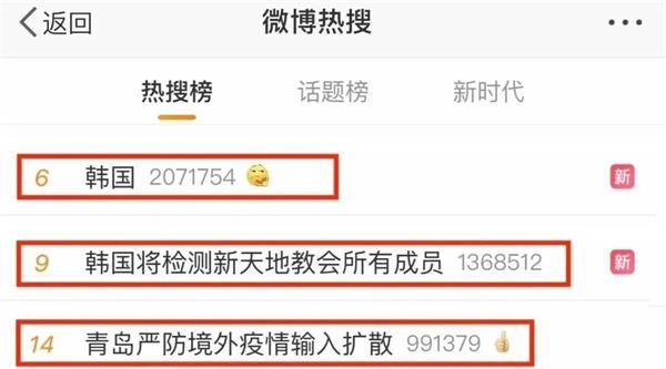 目前有三个与韩国相关的话题均登上了微博热搜榜,“青岛严防境外疫情输入扩散”的话题从昨天开始一直榜上有名。