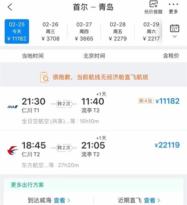 一般来说,首尔直飞青岛每天都有五趟左右航班,而今天仅剩两趟转机航班,且价格均在万元以上。