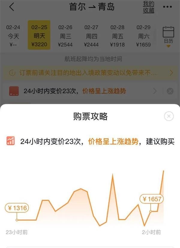 根据飞猪显示,有一趟首尔到青岛的航班24小时内变价23次,价格呈现上涨趋势。
