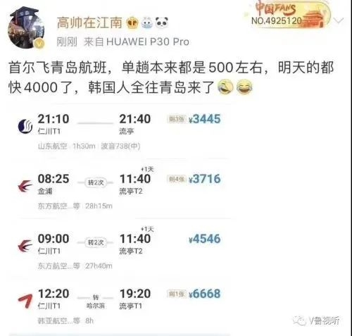 昨晚在网上流传甚广的一张截图显示,2月25日从首尔仁川机场直飞青岛流亭机场的机票价格高达近3500元。