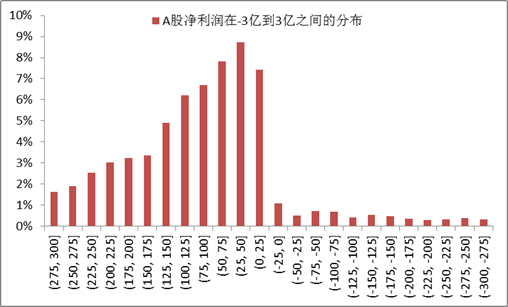 根据2018年报数据,对A股和美股上市公司净利润(换算成人民币)规模在3亿人民币和-3亿人民币的样本进行等间距的分档,统计每档的公司占比。发现A股净利润为负的区间分布明显异常。
