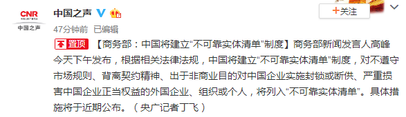 央广消息,商务部新闻发言人高峰今天下午发布,根据相关法律法规,中国将建立“不可靠实体清单”制度,对不遵守市场规则、背离契约精神、出于非商业目的对中国企业实施封锁或断供、严重损害中国企业正当权益的外国企业、组织或个人,将列入“不可靠实体清单”。具体措施将于近期公布。