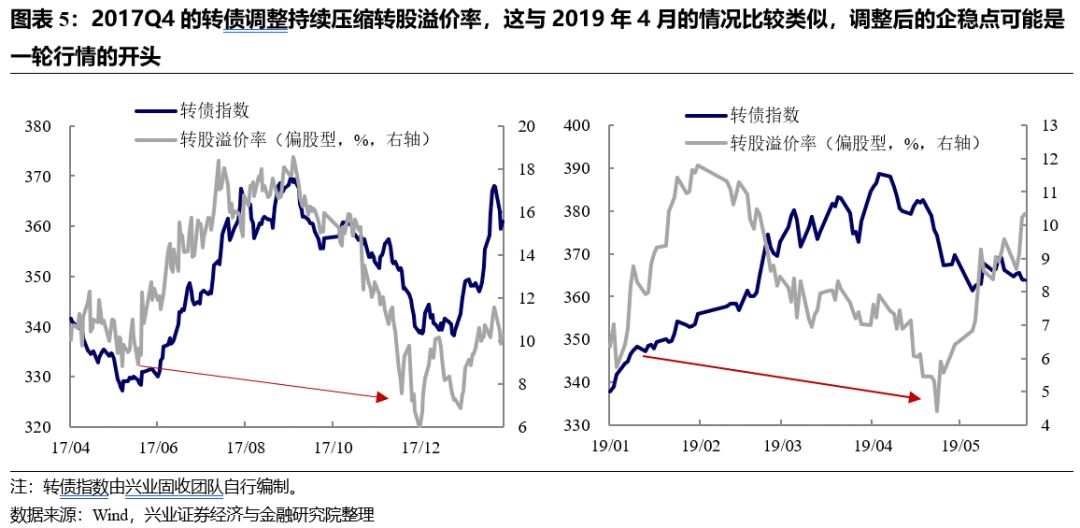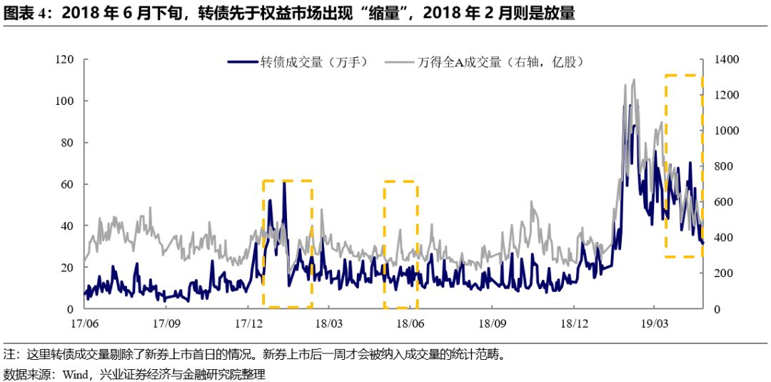 2017年9月至12月、2019年4月的转债调整属于高位调整,且背后并没有权益市场的极速下跌(如2018年2月),虽然在调整初期转债市场就已经缩量(如2017年10月15日至19日、2019年4月9日至4月15日),但从事后看并没有什么指导意义,反而在后续调整有继续放量的情况出现。