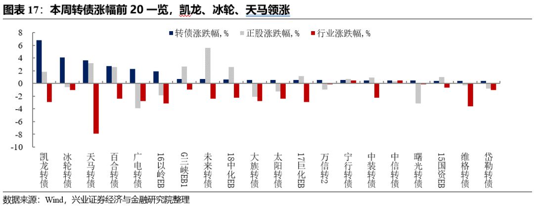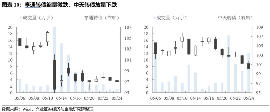 虽然市场整体缩量,不过个券并非均是如此,本周中略有放量的除了有明显涨幅的、、等博弈性品种外,还有两只关注度较高的大盘标的光大转债和中天转债,而这两只均在下跌中出现放量。