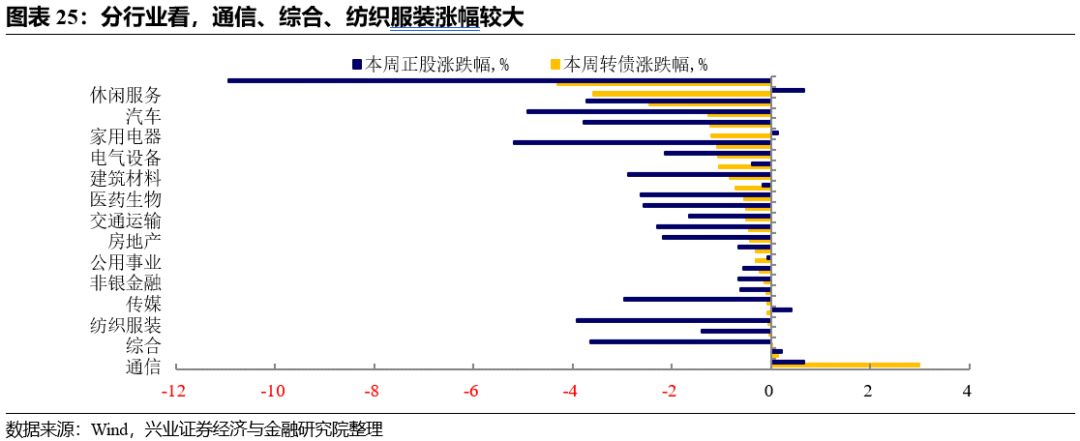 指数本周下跌0.86%,跌幅小于主要股指。交投活跃度方面,整体成交量持续下滑。估值方面,转股溢价率小幅回升。分品种看,金融与非金融转债指数表现差异不大。分规模看,中盘指数表现较好。分类型看,公募EB指数表现稍好。分评级看,AA+级转债指数表现较好。分行业看,通信、综合、纺织服装领涨,休闲服务、汽车、家用电器跌幅较大。个券方面,凯龙、冰轮、天马领涨,金农、三力、东音等跌幅较大。