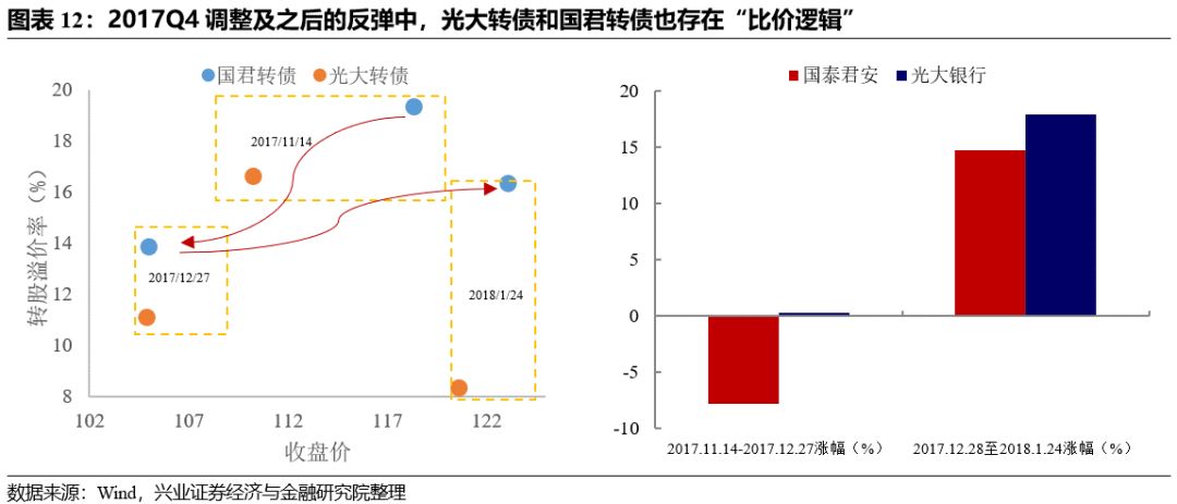 在权益市场偏弱的情况下,转债“债性”表现地更加明显一些,这一特性体现在价格上即是存在“比价逻辑”,2017Q4的调整中也有如此现象。以彼时市场上仅有的两只大盘金融标的光大转债和国君转债为例,2017年11月14日至12月27日转债市场整体出现了价格和估值双杀,光大转债虽然正股并没有下跌,但还是跟随国君转债下挫至约105元、转股溢价率11%的极低定位。