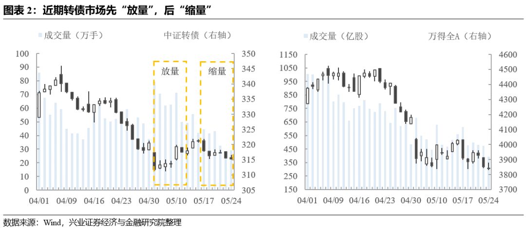 近期转债成交量有明显的变化,但股市变化不大。5月6日转债放量下跌,但随后5月7日至10日基本都保持在与5月6日类似的水平,反观权益市场(以万得全A为例),5月6日成交量是近期的最高水平,其后震荡中成交量波动不大。5月7日至10日转债与权益市场成交量相对之前的差异,背后对应着转债先于权益市场出现企稳。