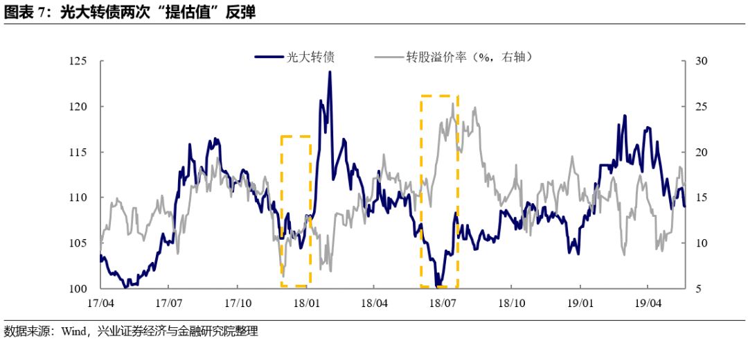以“参与”两次反弹的光大转债为例:1)2017年12月初光大转债的转股溢价率被压缩至极低水平,随后出现短期的提估值反弹。彼时与光大转债类似、价格和转股溢价率被大幅压缩的还有国君转债、、、三一转债等,这些标的反弹中均出现了高于正股的涨幅;2)2018年6月光大转债的转股溢价率虽然没有被明显压缩,但保持在一个相对稳定的水平上意味着转债并没有在偏低价格时发挥出抗跌特性(偏股型转债和转债整体的转股溢价率均是如此),而在7月的反弹中光大转债转股溢价率逐渐恢复(也是如此),涨幅高于正股。