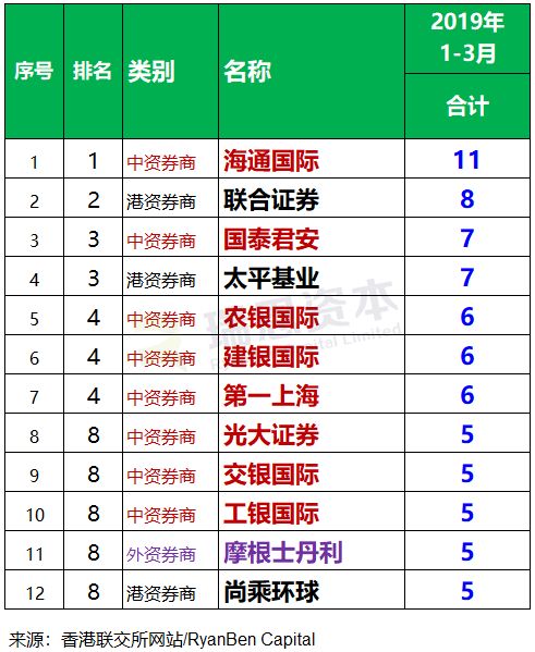 截止2019年3月31日,香港持有保荐人牌照的券商115家,其中的35家券商,在2019年以上市保荐人、或联合保荐人的身份参与了43家新挂牌公司的保荐工作,根据他们所参与保荐(包括联合保荐)新挂牌公司的数量,Ryanben汇总编制排名如下: