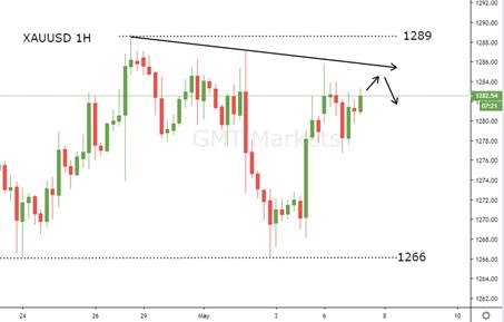 日内展望:金价近期的高点不断下移,而上方高点1289区域将会是黄金重要阻力区域。除非上破该区域,否则黄金将继续展开回撤。