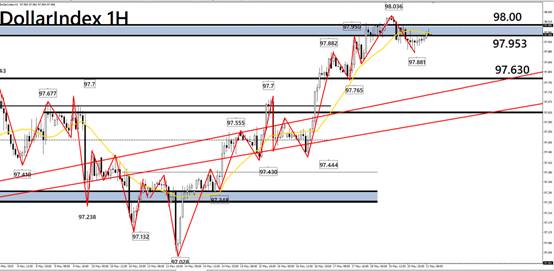 美元指数技术面上均线上弯且K线于均线上排列,高低点持续向上推移,亚盘时段持续多方思维。